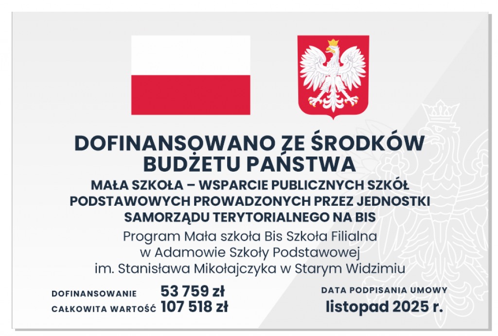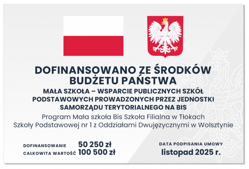 Gmina Wolsztyn otrzymała wsparcie finansowe na zakup wyposażenia w postaci dotacji celowej na realizację zadania pn. „Program Mała szkoła Bis Szkoła Filialna w Tłokach Szkoły Podstawowej nr 1 z Oddziałami Dwujęzycznymi w Wolsztynie” oraz „Program Mała szkoła Bis Szkoła Filialna w Adamowie Szkoły Podstawowej im. Stanisława Mikołajczyka w Starym Widzimiu”.